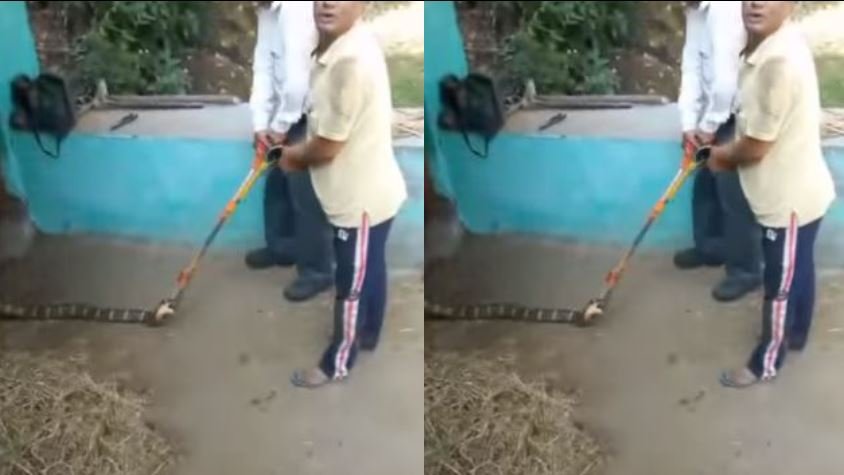 मीडिया रिपोर्ट्स के अनुसार, 16 फीट लंबा कोबरा चौमू गांव में गाय की गोठ में घुस गया। कोबरा को देखकर वहां बंधे गाय और अन्य पशुओं ने शोर मचाना शुरू कर दिया। इसके बाद स्थानीय लोगों वहां पहुंचे। जब लोगों ने कोबरा को देखा तो हैरान रह गए। आनन फानन में वन विभाग को सूचना दी गई। मौके पर वन विभाग की टीम पहुंची और काफी मशक्कत के बाद कोबरा को पकड़ने में कामयाब रही।
