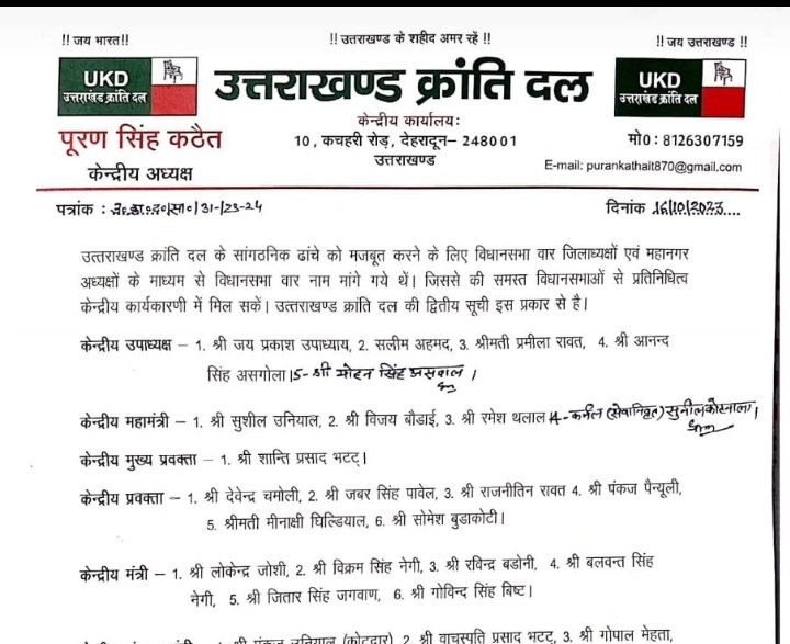 उत्तराखंड क्रांति दल के केंद्रीय अध्यक्ष श्री पूरणसिंह कठैत जी द्वारा केंद्रीय कार्यकारिणी की द्वितीय सूची जारी की। श्री कठैत जी द्वारा समस्त जिलाध्यक्ष एवं महानगर अध्यक्ष से विधानसभावार नाम मांगे गये थे, जिससे कि केंद्रीय कार्यकारिणी में प्रतिनिधित्व मिल सके और आगामी लोक सभा, निकाय व पंचायत चुनावों की तैयारी में सहजता मिले।