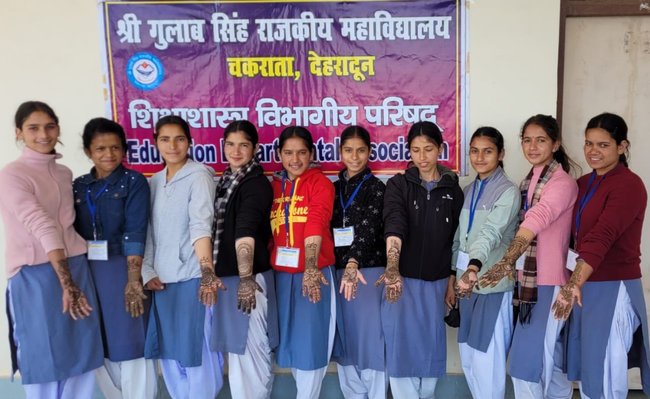 श्री गुलाब सिंह राजकीय महाविद्यालय चकराता में शिक्षाशास्त्र विभागीय परिषद के तत्वावधान में आयोजित मेंहदी प्रतियोगिता में अंकिता ने प्रथम स्थान प्राप्त किया। बुधवार को शिक्षाशास्त्र विभागीय प्रभारी डा.सुमेर चंद के निर्देशन में आयोजित मेंहदी प्रतियोगिता में छात्राओं ने बढ़-चढ़ कर प्रतिभाग किया। अपनी रचनात्मक और कलात्मक प्रतिभा को दर्शाते हुए छात्राओं ने खूबसूरत मेंहदी लगाई। निर्णायक मंडल की प्राध्यापिकाओं डा.जयश्री थपलियाल, डा.स्वाति शर्मा व डा.पूजा रावत ने लगाई गई मेंहदी का अवलोकन कर अंकिता,शिवानी व बनिता को क्रमश: प्रथम, द्वितीय व तृतीय स्थान के लिए चुना। प्राचार्य प्रो.के.एल.तलवाड़ ने विजयी प्रतिभागियों को शुभकामनाएं दी और बताया कि मई माह के अंतिम सप्ताह में आयोजित होने वाले वार्षिकोत्सव में इन्हें पुरस्कृत किया जायेगा।