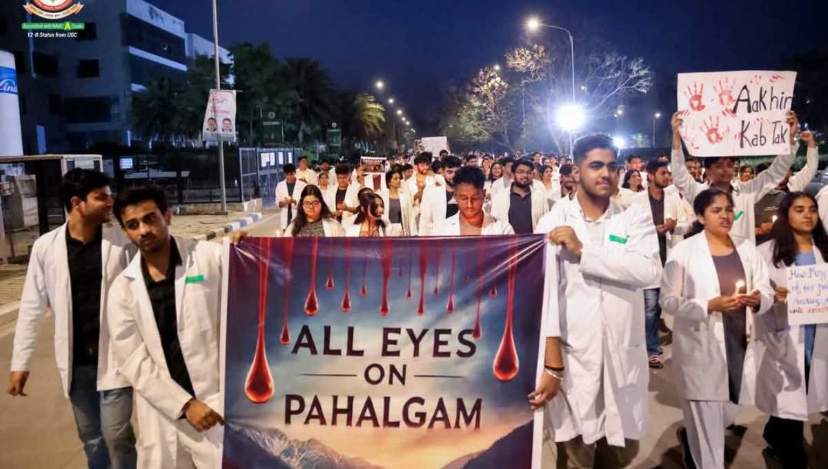 एमबीबीएस के स्टुडेंट्स- हर्ष कौशिक, अमूल त्यागी, शाश्वत मिश्रा, ऋषभ सिंह, सत्याम वार्ष्णेय, हर्षित शर्मा, अभय पांडेय, अभिनव राव ने पहलगाम हमले की कड़े शब्दों में निंदा करते हुए कहा, आतंकवादियों का यह हमला कायराना है। दो दर्जन से अधिक बेकसूर पर्यटकों की मौत सेे कश्मीर से लेकर कन्याकुमारी तक उबाल है। मेडिकल स्टुडेंट्स ने केंद्र सरकार से कहा, कश्मीर में प्रोटेक्शन को ओर मजबूत किया जाना चाहिए। साथ ही सरकार को आतंकवाद के विरुद्ध ठोस सख्त फैसले लेने चाहिए, ताकि भविष्य में इस तरह की घटनाएं न हों। श्रद्धांजलि कार्यक्रम में रुद्रांश भारद्वाज, सलोनी जैन, दिविश अग्रवाल, नक्षत्र शेखावत, गुणिका मल्होत्रा, निपुण भारद्वाज, सृष्टि दुबे समेत एमबीबीएस फर्स्ट, सेकेंड, थर्ड और फोर्थ ईयर के 250 से अधिक छात्र-छात्राएं शामिल रहे।