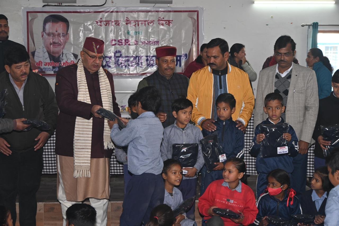 राजकीय इण्टर कालेज, डोभालवाला में छात्र-छात्राओं को स्वेटर वितरण करते मंत्री गणेश जोशी।