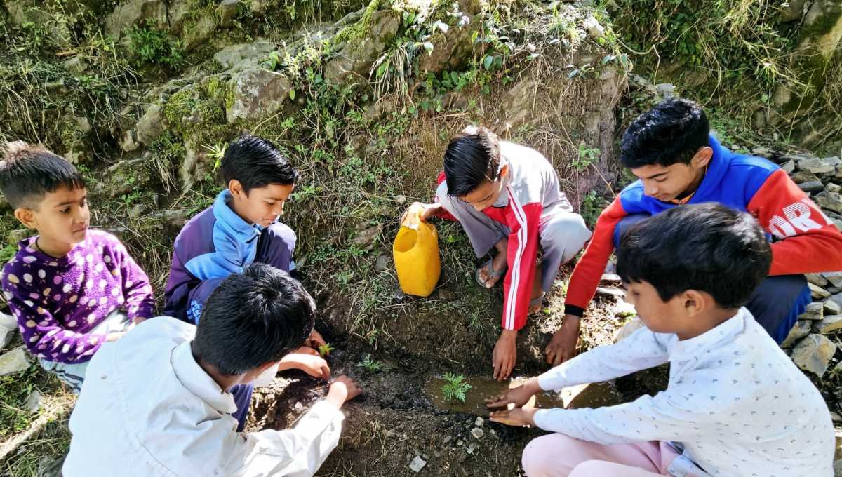 बच्चों ने गोदीन गांव के प्राकृतिक जल स्रोत के धारे में सफाई के बाद “धार-पूजा” कर यह संकल्प लिया गया कि गांव की यह निर्मल धारा हमेशा अविरल बहती रहे। जल संरक्षण के लिए बच्चों ने पौध-रोपण भी किये।