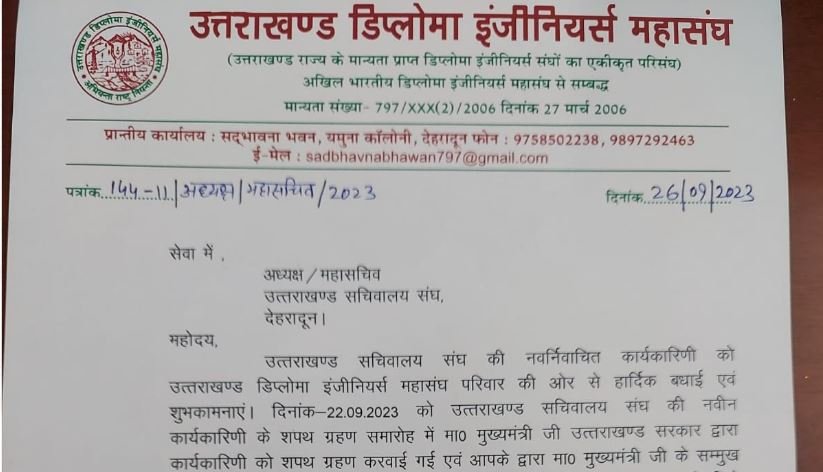 उसके लिए संघ उनका आभार व्यक्त करता है सचिवालय सचिवालय संघ के उपाध्यक्ष जीतमणी पैन्यूली संयुक्त सचिव रंजीत रावत ने डिप्लोमा इंजीनियर संघ का आभार व्यक्त करते हुए कहा कि वर्तमान संघ सभी मान्यता प्राप्त संघों के साथ बेहतर तालमेल एवं समन्वय के करते हुए सभी संघों का सम्मान करते हुए कार्मिक हितों की संदर्भ में जो भी मांगे होगी उनको गंभीरता के साथ आपसी सहयोग बनकर सरकार एवं शासन के समक्ष रखता रहेगा एवं कार्मिक हित में अधिक से अधिक कार्य कराए जाएंगे गोल्डन कार्ड पुरानी एसीपी एवं अन्य पदोन्नति संबंधी बिंदुओं पर लगातार सचिवालय संघ कार्य करता रहेगा जिससे अधिक से अधिक कार्मिकों को इसका लाभ मिल सके और उनके हितों का संरक्षण हो सके।
