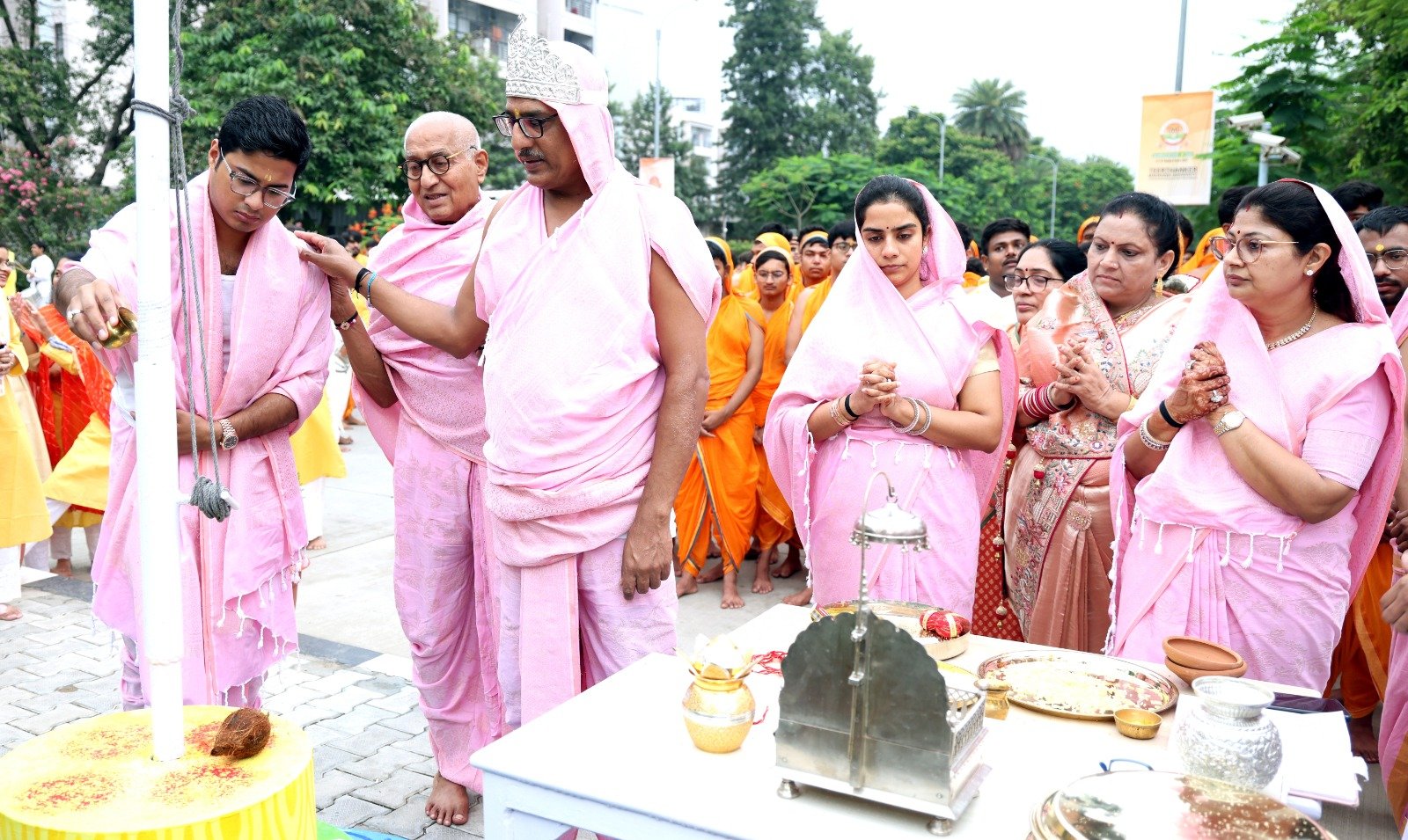 पर्वाधिराज दशलक्षण महामहोत्सव का जिनालय पर ध्वजारोहण के संग शंखनाद हुआ। उत्तम क्षमा दिवस पर ध्वजारोहण के दौरान विधि-विधान की प्रक्रिया प्रतिष्ठाचार्य श्री ऋषभ जैन शास्त्री के सानिध्य में हुई। उन्होंने समुच्चय पूजन, सोलह कारण, पंच मेरु पूजन, दशलक्षण पूजन कराया। सुबह सात बजे श्री 1008 आदिनाथ भगवान को पालकी में विराजमान करने का सौभाग्य सौधर्म इंद्र के रुप में प्रो. एसके जैन को प्राप्त हुआ। दिव्यघोष के बीच श्रीजी को मंदिर से रिद्धि-सिद्धि भवन तक लाया गया, जिसमें श्रावक-श्राविकाएं नृत्य आदि में मंत्र-मुग्ध हो गए। श्रीजी का समोवशरण रिद्धि-सिद्धि भवन में किया गया। पालकी को उठाने का सौभाग्य प्रथम इंद्र- कलश जैन, द्वितीय इंद्र- प्रिंस जैन, तृतीय इंद्र- सम्यक जैन को मिला। ध्वजारोहण से पालकी यात्रा के दौरान कुलाधिपति सुरेश जैन, फर्स्ट लेडी श्रीमती वीना जैन, श्रीमती ऋचा जैन, श्रीमती जहान्वी जैन के संग-संग समस्त टीएमयू जैन परिवार की उल्लेखनीय उपस्थिति रही। दिव्यघोष के दौरान श्रावक केसरिया धोती-दुपट्टा पहने थे, जबकि श्राविकाएं केसरिया और सफेद कुर्ता- सफेद सलवार, नारंगी चुनरी के संग पहनी थी, जबकि कुलाधिपति, जीवीसी और ईडी ऑफ पिंक परिधान धारण किए हुए थे। इनकी भव्यता देखते ही बनती थी। प्रतिष्ठाचार्य श्री ऋषभ जैन शास्त्री ने श्रावक-श्राविकाओं का नियम दिलाया कि आज कोई भी क्रोध नहीं करेगा।