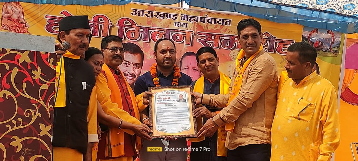 जिसे प्रेम एंव साैहार्द के साथ मनाना चाहिये कार्यक्रम की अध्यक्षता कर रहे ब्लाक प्रमुख प्रदीप चंद रमाेला ने कहा कि हाेली का त्याैहार हमे जीवन भर सुख एंव दु:ख मे संगठित रहकर भाई चारे से जीना सिखाता है इस अवसर पर दूर दराज क्षेञाें से हाेली मिलन के अवसर पर एकञित हुये सभी लाेगाें ने आपस मे रंग गुलाल लगाकर मिठाईयां बांटी हाेली मिलन मे गढवाली गीताें के शानदार सांस्कृतिक कार्यक्रमाें की भी दिनभर धूम मची रही जिसका लाेगाें ने खूब आनंद लिया इस माैके पर उत्तराखंड महापंचायत द्वारा विभिन्न क्षेञाें मे कार्य करने वाली आशा ,आंगनबाडी ,महिला समाख्य एंव बाेर्ड की परीक्षाआें मे उत्कृष्ट रहने वाली 20 बालिकाआें एंव महिलाआें काे प्रशस्ति पञ देकर सम्मानित किया गया हाेली मिलन कार्यक्रम मे महंत मनाेज प्रपन्नाचार्य ,महंत जगदीश प्रपन्नाचार्य , उत्तम चंद रमाेला, उत्तराखंड महापंचायत के अध्यक्ष गजेंद्र कंडियाल, कार्यकारी अध्यक्ष डा0 धीरेंद्र रांगड, संरक्षक रमाब्बलभ भट्ट, भगवती प्रसाद रतूडी,महिपाल बिष्ट, शिव प्रसाद बहुगुणा, याेगेश राणा, हिमांशू बिजल्वाण, बीना जाेशी, दिनेश काेठारी, शुशील नाैटियाल,ब्रहमानंद भट्ट आदि माैजूद थे