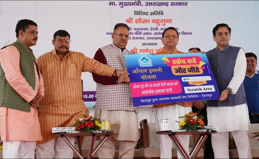 मुख्यमंत्री पुष्कर सिंह धामी ने मंगलवार को सर्वे ऑफ इण्डिया स्टेडियम, हाथीबड़कला, देहरादून में आयोजित कार्यक्रम में प्रतिभाग करते हुए राज्य पशुधन मिशन योजनान्तर्गत लाभार्थियों को चेक वितरण किए। उन्होंने आंचल ब्राण्ड के तहत आंचल शहद एवं आंचल इनामी योजना का भी शुभारम्भ किया।