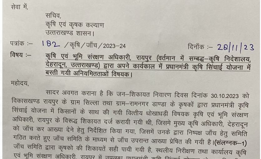 जिलाधिकारी श्रीमती सोनिका की अध्यक्षता में 30 अक्टूबर 2023 को आयोजित जनसुनवाई कार्यक्रम में विकासखण्ड रायपुर के ग्राम सिल्ला एवं रामनगर डांडा के कृषकों द्वारा प्रधानमंत्री कृषि सिंचाई योजना में अनियमितता की शिकायत की गई थी। जनसुनवाई में किसानों द्वारा तत्समय कार्यरत कृषि एवं भूमि संरक्षण अधिकारी रायपुर के विरूद्ध वित्तीय धोखाधड़ी किये जाने की शिकायत करते हुए सम्बन्धित के विरुद्ध कार्यवाही की मांग की गई थी।