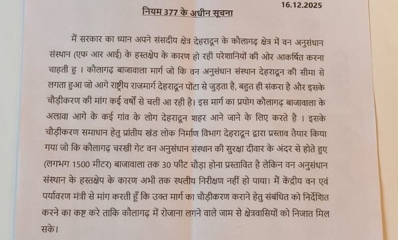 श्रीमती माला राज्य लक्ष्मी शाह ने केंद्रीय वन, पर्यावरण एवं जलवायु परिवर्तन मंत्री से आग्रह किया कि जनहित को ध्यान में रखते हुए उक्त मार्ग के शीघ्र चौड़ीकरण हेतु आवश्यक अनुमति प्रदान की जाए, ताकि स्थानीय नागरिकों को सुरक्षित, सुगम एवं निर्बाध आवागमन की सुविधा मिल सके।