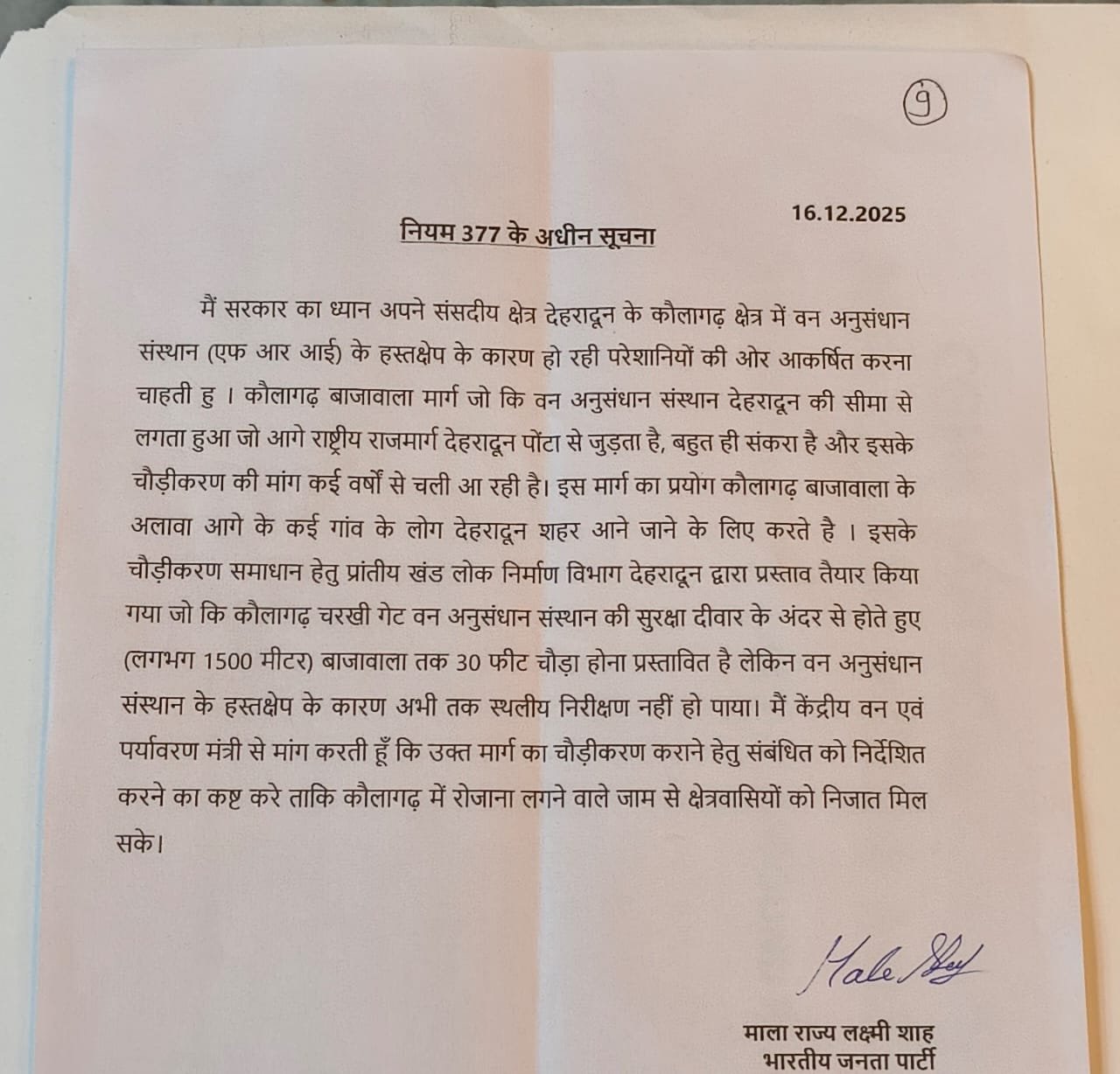 श्रीमती माला राज्य लक्ष्मी शाह ने केंद्रीय वन, पर्यावरण एवं जलवायु परिवर्तन मंत्री से आग्रह किया कि जनहित को ध्यान में रखते हुए उक्त मार्ग के शीघ्र चौड़ीकरण हेतु आवश्यक अनुमति प्रदान की जाए, ताकि स्थानीय नागरिकों को सुरक्षित, सुगम एवं निर्बाध आवागमन की सुविधा मिल सके।