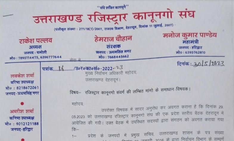 उक्त लम्बित मांगो के सम्बन्ध में उत्तराखण्ड रजिस्ट्रार कानूनगो संघ के पत्र संख्या-17/उ०र०का०सं०-2022-23 की प्रति श्रीमान जी को पूर्व में संघ के पत्र संख्या-03/०का०सं०/2023 दिनांक 05.06.2023 के द्वारा संलग्न कर आवश्यक कार्यवाही हेतु दिनांक 06.06.2023 को जिला कार्यालय में प्रेषित किया जा चुका है।