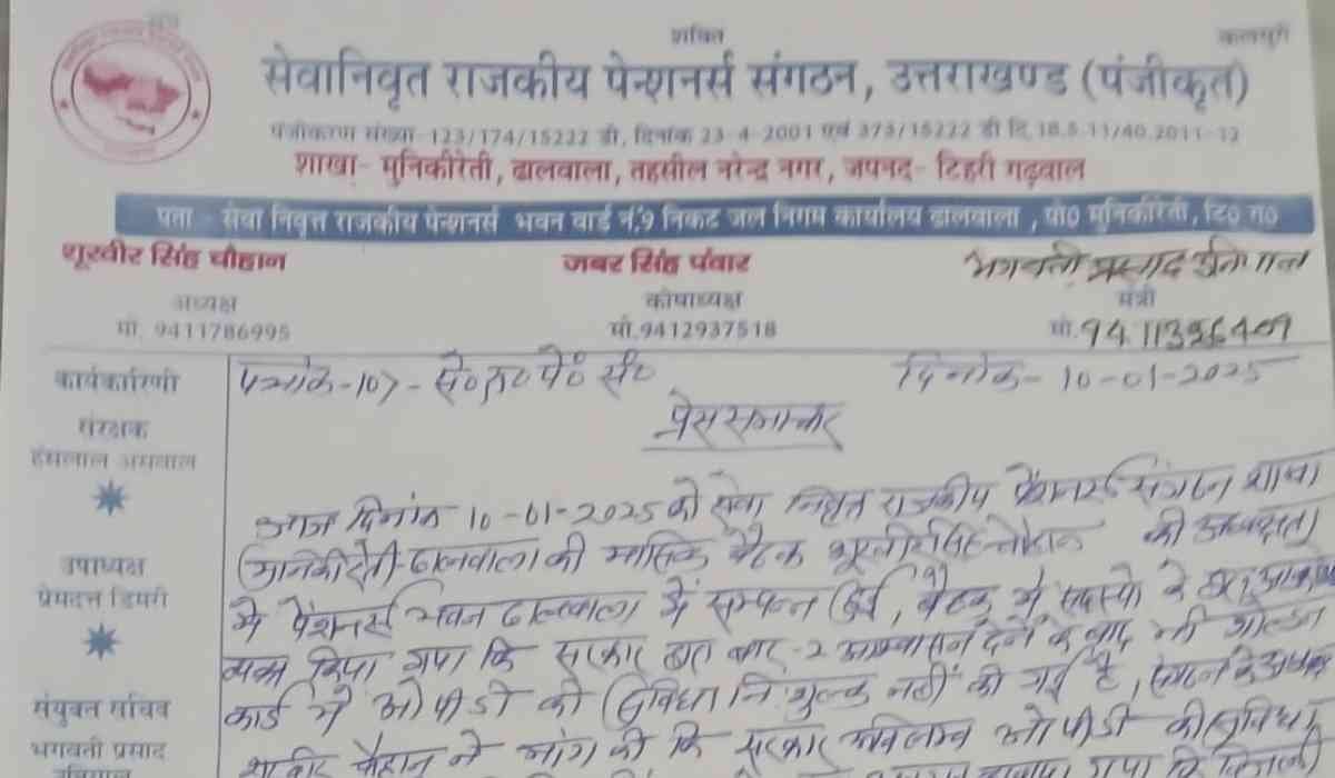 बैठक में संगठन के सचिव भगवती प्रसाद उनियाल ने 30 जून/31 दिसंबर को सेवानिवृत्त होने वाले कार्मिकों को एक नोशनल(काल्पनिक) वेतन वृद्धि अनुमन्य किए जाने की तिथि उत्तर प्रदेश की भाँति 1-1-2006 करने की मांग की। संगठन के कोषाध्यक्ष जबरसिंह पंवार ने सरकार से मांग की कि गोल्डन कार्ड की ओ.पी.डी.व जांच नि:शुल्क करने एवं लगभग 35000 पेशनरों के पुन: गोल्डन कार्ड बनाने का शासनादेश निर्गत करने की सरकार से प्रबल मांग की है।