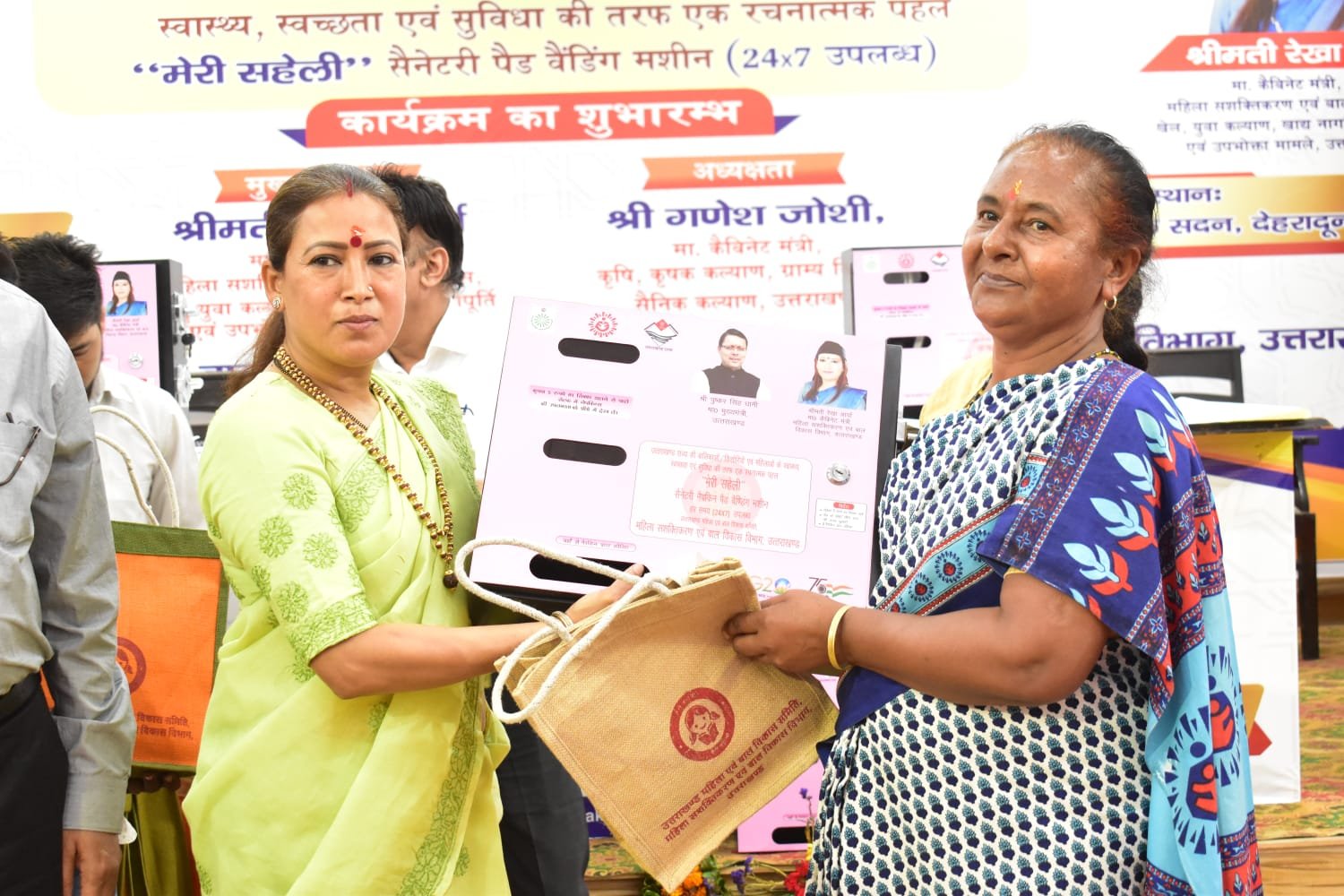 कैबिनेट मंत्री रेखा आर्या ने जानकारी देते हुए बताया कि मा० मुख्यमंत्री जी के द्वारा दिनांक 09 नवम्बर 2021 को जनपद देहरादून में राज्य स्तरीय घोषणा “जी रैया चेली-जागी रैया नौनी” की गयी, जिसमें बालिकाओं, किशोरियों एवं महिलाओं को उनके घर के ही निकट नैपकिन उपलब्ध कराने के उद्देश्य से प्रत्येक आंगनवाड़ी केन्द्र में सैनेटरी नैपकिन वैण्डिंग मशीन की स्थापना किये जाने की घोषणा कही गयी।