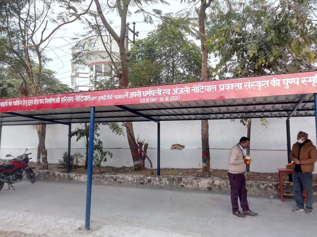 शिक्षिका पत्नी की स्म्रति में बनाया पार्किंग शेड।