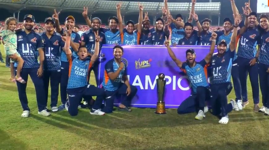 उत्तराखंड प्रीमियर लीग के पहले सीजन की ट्रॉफी टिहरी टाइटंस ने छह विकेट से जीत ली है। यह इतिहास देहरादून के राजीव गांधी क्रिकेट स्टेडियम में रचा गया। शुक्रवार को उत्तराखंड प्रीमियर लीग के फाइनल मैच में पिथौरागढ़ चैंप्स ने पहले बेटिंग करते हुए 20 ओवर में आठ विकेट खोकर 139 रन बनाये थे, जबकि टिहरी टाइटंस ने जीत के लिए मिले 140 रनों के लक्ष्य को 19.1 ओवर में चार विकेट खोकर हासिल कर लिया।