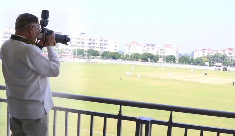फोटो परिचयःयादों का झरोखाः नामचीन लॉर्डस पवेलियन के पैटर्न पर निर्मित टीएमयू के क्रिकेट पवेलियन से 2015 में उत्तर प्रदेश बनाम मध्य प्रदेश के बीच खेले जा रहे रणजी मैच के विहंगम दृश्य को डीएसएलआर कैमरे में कैद करते हुए तीर्थंकर महावीर यूनिवर्सिटी के कुलाधिपति श्री सुरेश जैन।