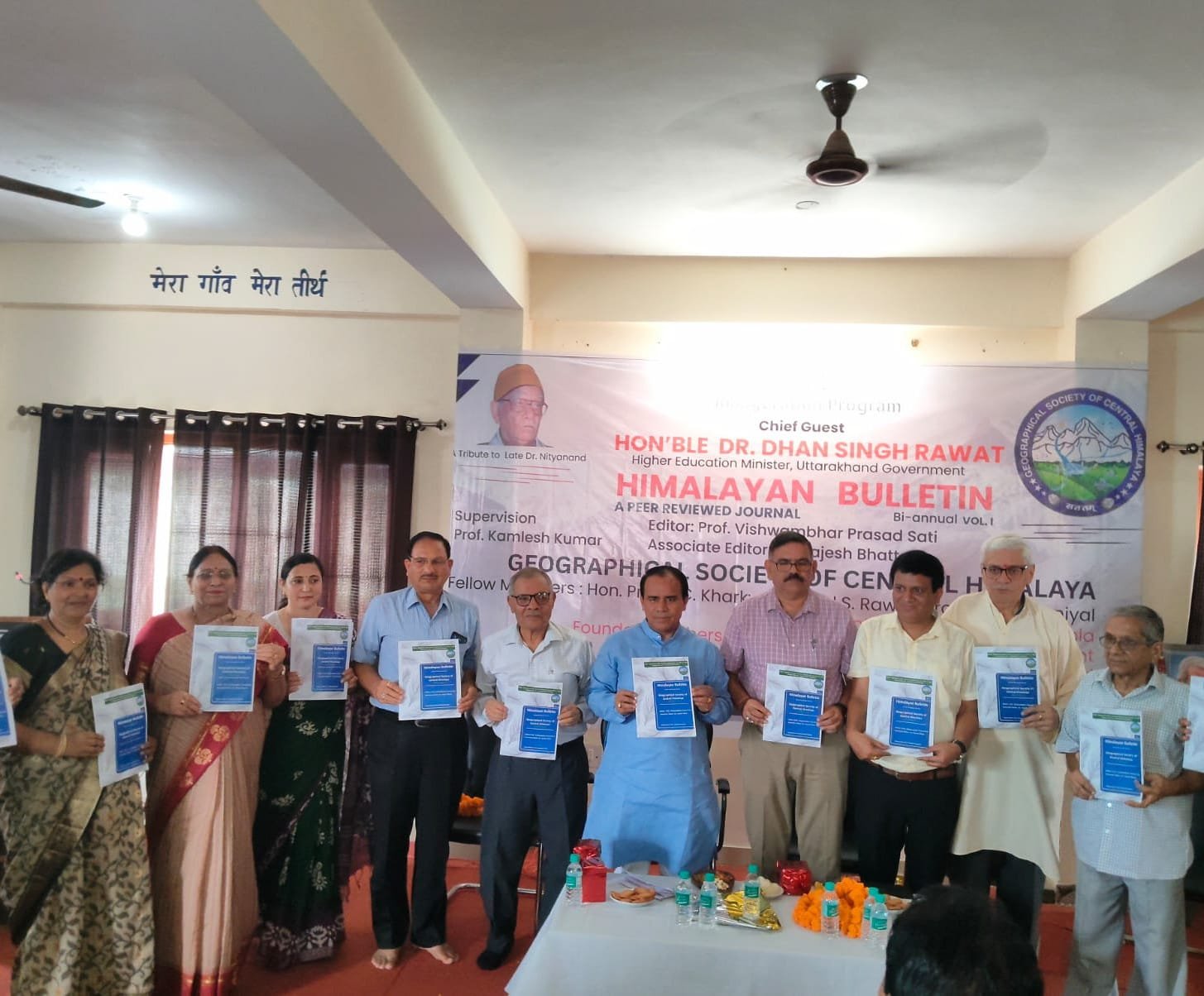 देहरादून 13 सितम्बर 2025 – जियोग्राफिकल सोसाइटी आफ सेन्ट्रल हिमालय संस्था की अर्ध वार्षिक पत्रिका ‘HIMALAYA BULLETIN’ के प्रथम संस्करण का उत्तराखण्ड सरकार के उच्च शिक्षा मंत्री डा० धन सिंह रावत के द्वारा विमोचन किया गया। देहरादून के अलकनंदा इनक्लेव कालोनी जोगीवाला रिंग रोड में स्थित ‘सेवा निकेतन’ भवन के डा० नित्यानंद सभागार में उत्तरांचल उत्थान परिषद एवं जियोलॉजिकल सोसायटी आफ सेन्ट्रल हिमालय संस्था के संयुक्त तत्वाधान में “HIMALAYA BULLETIN” के विमोचन कार्यक्रम का आयोजन किया गया। इस कार्यक्रम में पहुंचे कार्यक्रम के मुख्य अतिथि – उच्च शिक्षा मंत्री डा० धन सिंह रावत ने दीप प्रज्ज्वलित कर कार्यक्रम का उद्घाटन किया गया। कार्यक्रम आयोजन समिति की ओर से मुख्य अतिथि कैबिनेट मंत्री डा० धन सिंह रावत एवं अन्य विशिष्ट अतिथियों एवं वक्ताओं – प्रोफेसर एस०सी० खर्कवाल, प्रोफेसर वी०पी० सती डा० कमलेश कुमार, उत्तरांचल उत्थान परिषद के संरक्षक प्रेम बड़ाकोटी, डा० डी०डी० चौनियाल, सोसायटी की अध्यक्ष प्रोफेसर अनिता रुडोला, प्रोफेसर बी०पी० नैथानी, प्रोफेसर बयानी को गुलदस्ता भेंट, माल्यार्पण एवं प्रतीक चिन्ह भेंट कर कर स्वागत एवं उन्हें सम्मानित किया गया। कार्यक्रम की अध्यक्षता सोसायटी के संरक्षक डा० कमलेश कुमार तथा संचालन सोसायटी के उपाध्यक्ष डा० राजेश भट्ट के द्वारा किया गया। बैठक में उच्च शिक्षण संस्थानों में कार्यरत एवं सेवानिवृत्त विद्वान प्रोफेसरों एवं हिमालय के बारे में जानकारी रखने वाले गणमान्य अतिथियों एवं उत्तरांचल उत्थान परिषद के सदस्यों एवं सामाजिक कार्यकर्ता एवं बुद्धिजीवी उपस्थित रहे।